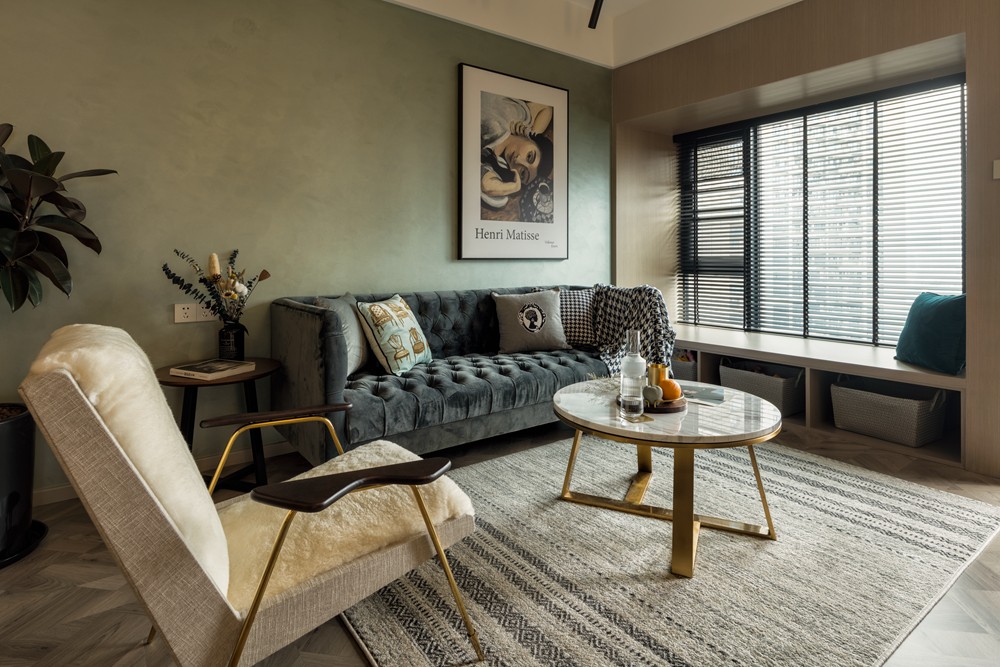 復(fù)古混搭風(fēng)格室內(nèi)家裝設(shè)計(jì),客廳色彩追求時(shí)尚且協(xié)調(diào),大理石搭配金色元素組合的圓茶幾和北歐風(fēng)地毯相結(jié)合,在整體風(fēng)格中減輕了色彩飽和度,視覺(jué)空間隨之延伸。