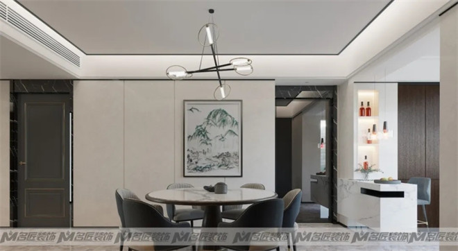 舒適圈的生活不能待太久,要走出來。設(shè)計更加如此,適當?shù)臎_突有其存在意義。不破不立是沖突更是再平衡,這也是設(shè)計存在的意義。平衡之術(shù)運用在每一個場景里,如同客廳里那一塊藝術(shù)背景墻,與茶幾上的盆栽遙遙相望,平衡左右。切割撕裂后又將其揉合平衡是趣味所在。