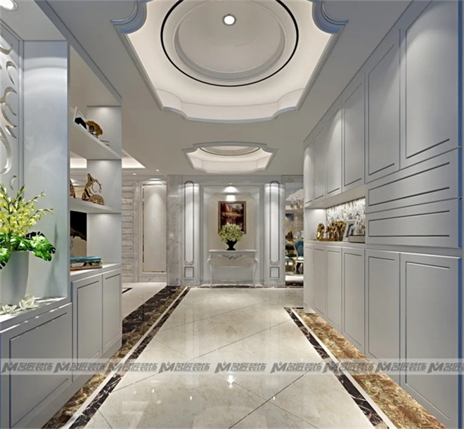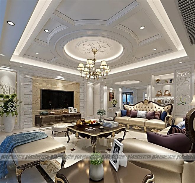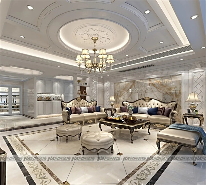 花紋對(duì)稱的金色大理石沙發(fā)墻面,線條對(duì)稱的白色窄框石膏線,以及復(fù)古的臺(tái)燈、擺飾,都展現(xiàn)出空間的規(guī)律美感,在視覺上達(dá)到平衡。造型古典的彎腿式沙發(fā),華麗的吊燈,精美的雕花鏤空隔斷,別致的拼花地磚,塑造出高貴典雅從容的居住空間。