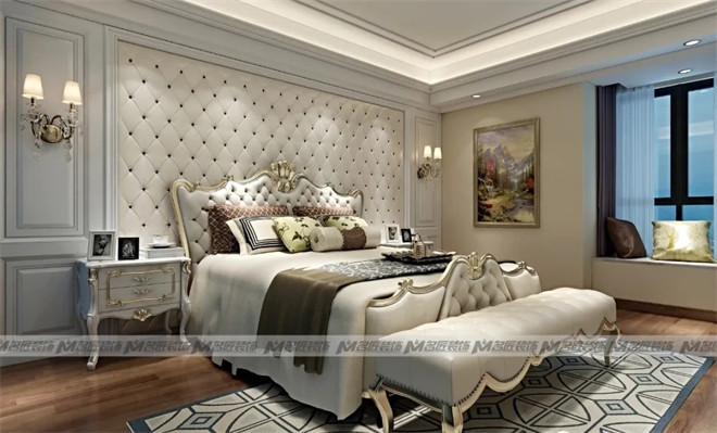 簡(jiǎn)歐風(fēng)格的主臥在高貴典雅的外表下,溫暖的情調(diào)在慢慢地散發(fā)開來(lái)。米白色的菱形軟包背景墻與床頭設(shè)計(jì)一致,起到裝飾作用的同時(shí),