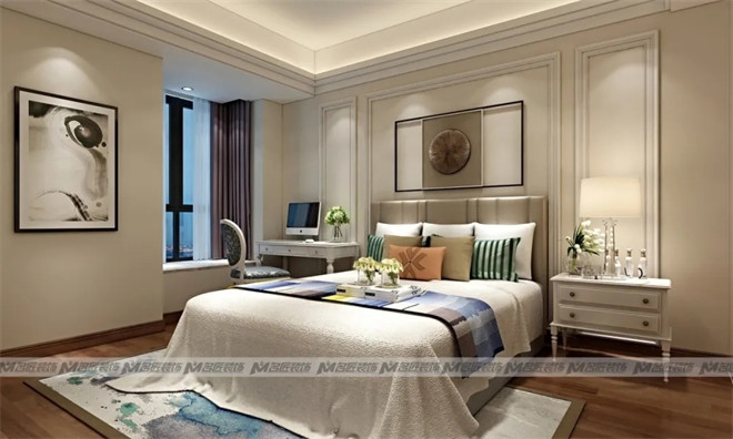 臥室整體色彩靜謐沉穩(wěn),延續(xù)米白色的主色調(diào),搭配棕色的木質(zhì)地板、藍(lán)白相間的幾何圖案地毯,象牙白色的床頭柜,黃銅金屬色的壁燈及油畫,從整體到局部,都給予人更深印象的層次感。