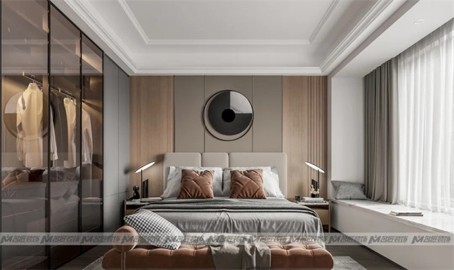 主臥的床背景是木飾面+咖色硬包拼接,并以充滿設計感的立體掛飾作為點綴,增添了時尚感。床頭兩側(cè)造型前衛(wèi)的臺燈,簡潔不失創(chuàng)意,與臥室風格渾然一體。