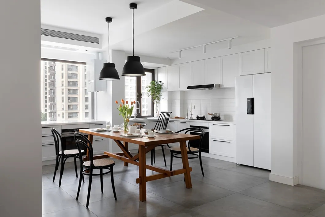室內(nèi)餐廳裝修案例,餐廚空間其實和客廳空間沒有區(qū)分的那么明顯,好似一個整體。