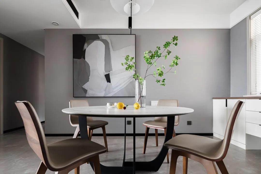 家裝設(shè)計餐廳裝修效果圖,柔和的灰色壁布在白與黑之間做了緩沖,線條流暢的桌椅帶來舒適體驗,墻上的裝飾畫呈現(xiàn)出流動之美,色塊纏繞交織,和諧一體,如同整體空間的設(shè)計理念