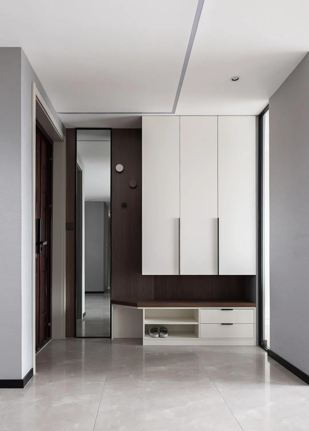 家裝設(shè)計玄關(guān)裝修效果圖,現(xiàn)代極簡風(fēng)格室內(nèi)家裝設(shè)計,玄關(guān)處的柜子的功能區(qū)分布井然有序,穿衣鏡頂天立地有棱有角,胡桃色飾面板上的圓形掛鉤將空間變得圓融