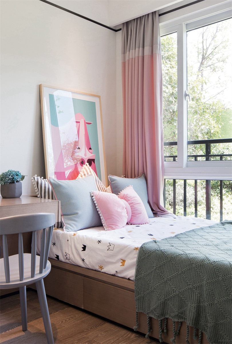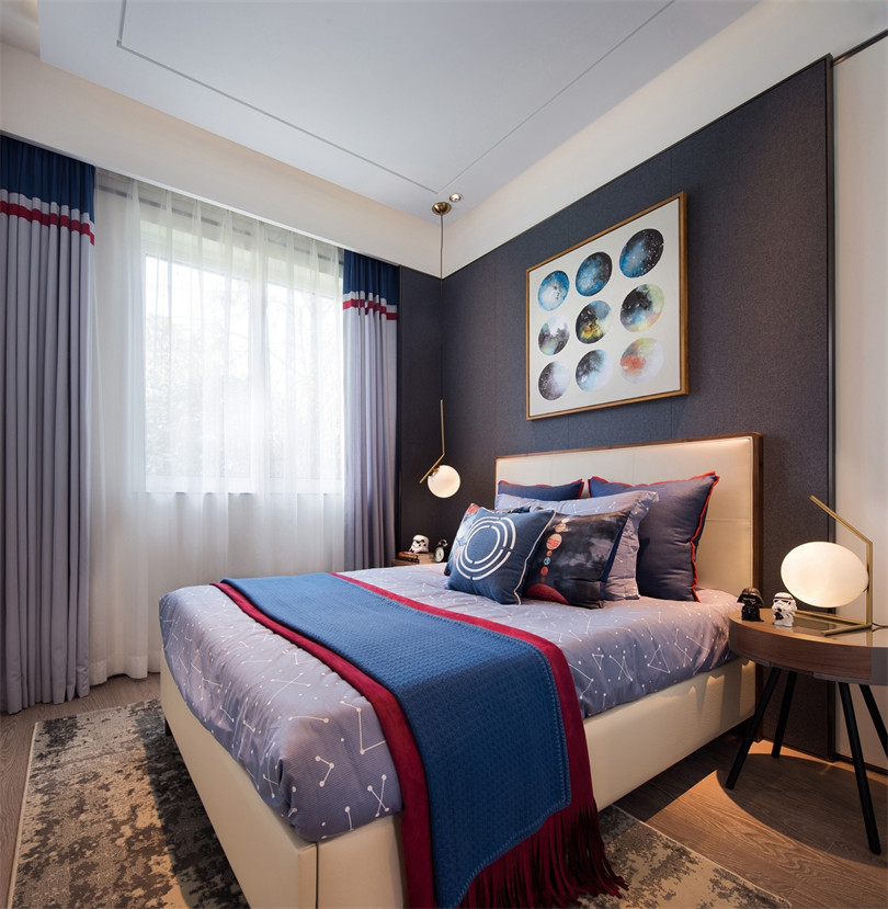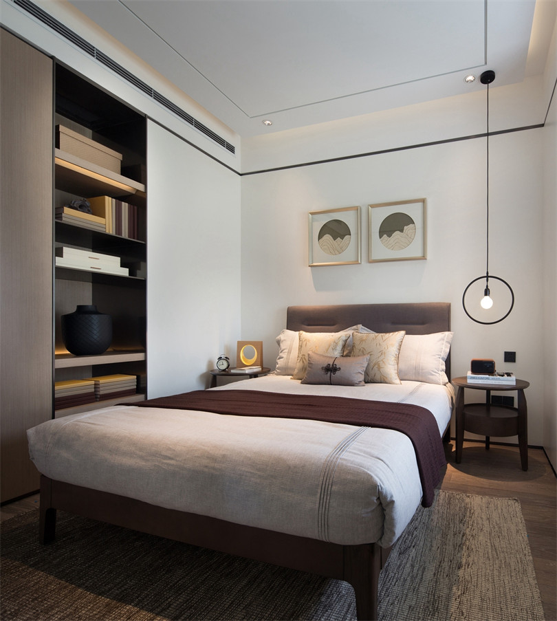 在臥室的打造上更為匠心獨(dú)具,主臥以“蓮”為主題,陶藝裝飾在平衡而和諧的布局里別有一派隱居之氣,茶具、手串等擺件無(wú)一不體現(xiàn)主人的簡(jiǎn)美生活情趣。老人房則充滿空間詩(shī)學(xué),衣柜鏡面的山水意境畫若隱若現(xiàn),傳達(dá)出空靈之美,更符合年邁之人的審美習(xí)性。兒童房的設(shè)計(jì)并沒有一味附和潮流,而是同其他空間和諧統(tǒng)一,安靜的色彩搭配、棋藝裝飾,讓孩子保持安靜的情緒,同樣能夠品味幽玄之美,遠(yuǎn)離都市的喧囂。