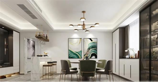 餐廳的設(shè)計(jì)延續(xù)了現(xiàn)代輕奢的風(fēng)格,整體呈現(xiàn)內(nèi)涵品質(zhì)的理想生活場景。墻體抽象畫和餐桌椅的顏色相得益彰,羅列的擺件增添了空間細(xì)節(jié)感悄悄地打動人心。一側(cè)的餐邊儲物柜美觀大方且實(shí)用,一切都剛剛好,彰顯優(yōu)雅舒適。