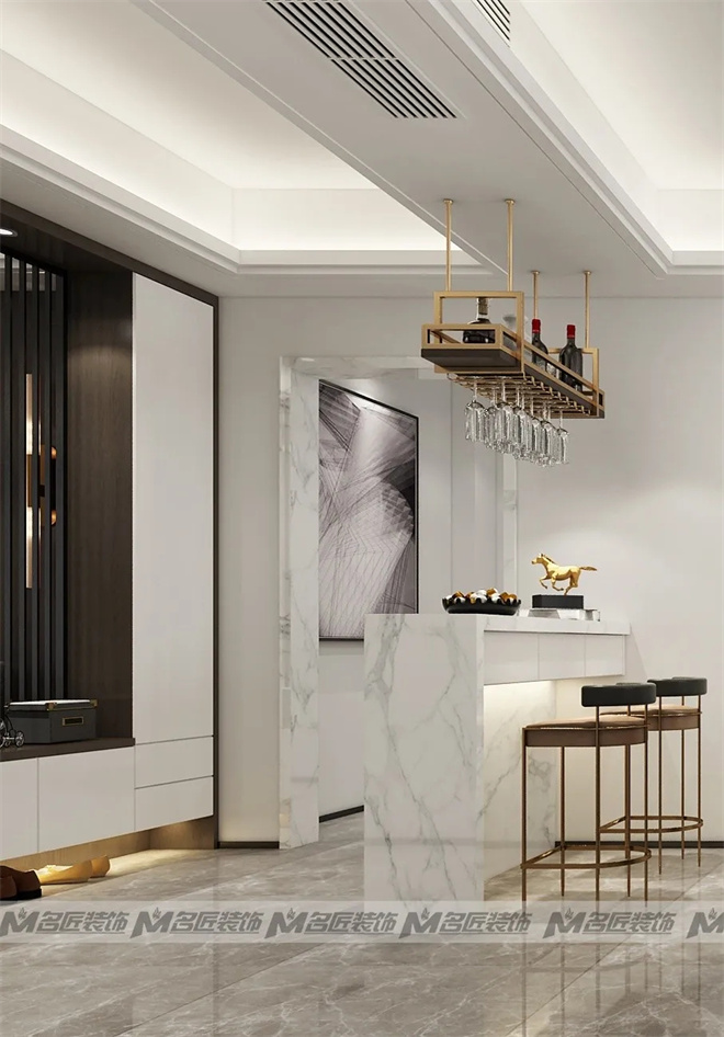 清晰現(xiàn)代的線條,灰色、胡桃木色、白色的巧妙搭配,大理石紋瓷磚與木飾面的運(yùn)用,塑造輕奢精致的空間氛圍。