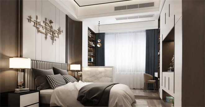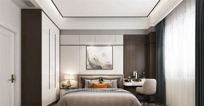 簡約的木飾面床背景,搭配灰咖色床品和同色系人字紋地毯,勾勒出和諧沉謐的美感。半面胡桃木色的墻面,與床背景、衣柜和諧且統(tǒng)一,充滿高級感。暖色系的燈光,中和了空間的冷色搭配,帶來了溫度。