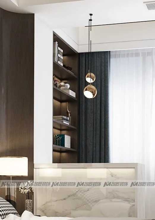 白色與胡桃木色經(jīng)典相融,當(dāng)兩者邂逅,一種沉穩(wěn)大氣的視覺效果,躍然眼前。半高的大理石墻體,規(guī)劃了書桌和臥室,僅一墻之隔,卻形成兩個獨(dú)立的生活空間。