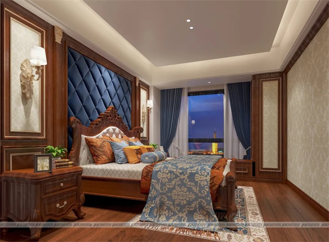 主臥設計讓人肅穆,墻面采用米黃色的經(jīng)典歐式花紋墻紙裝飾,高檔的藏藍色啞光軟包床頭背景墻,尊貴與格調不言而喻。
