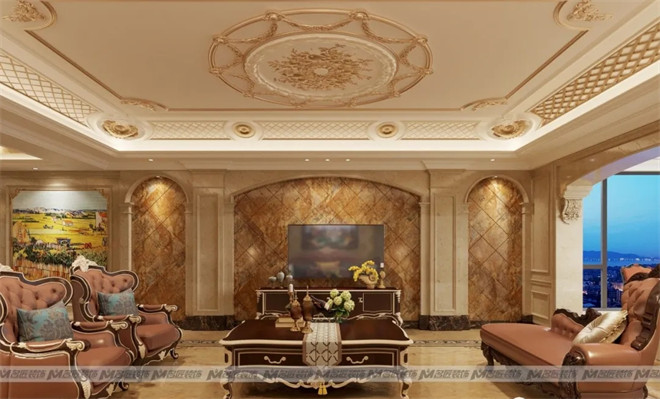 客廳的墻面大面積地使用米黃色系的石材來裝飾,與大理石拼花的地面相映成輝,石材天然的紋理使空間多了一份自然純粹。深色的皮質沙發(fā)是客廳的主角,古樸典雅,藝術感濃厚。不僅帶來感官上的平衡舒適,更帶有莊重感。暖黃色的燈光在石材的反射下,整個空間流光溢彩,華貴絢麗。