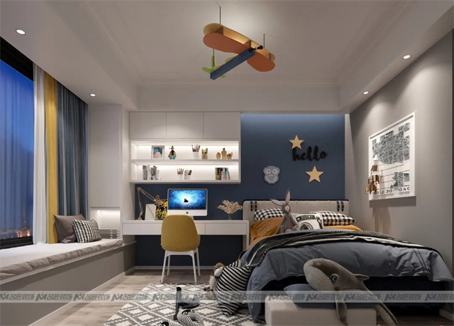 小男孩的房間營造出自由自在的趣味感,深藍色為主色調,星星、鳥兒、卡通飛機吊燈、立體火箭裝飾畫作為點綴,好似進入了一個擁有無限想象魔力的空間,承載著小男孩對宇宙滿滿的好奇心與探險精神。