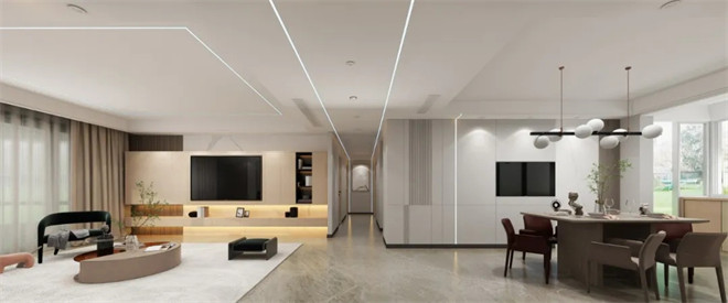 整個(gè)開(kāi)放式的空間極具開(kāi)放性,在簡(jiǎn)潔的基調(diào)上,利用現(xiàn)代和新中式風(fēng)的家具、燈具及飾品裝飾出新古之韻的雅宅。
