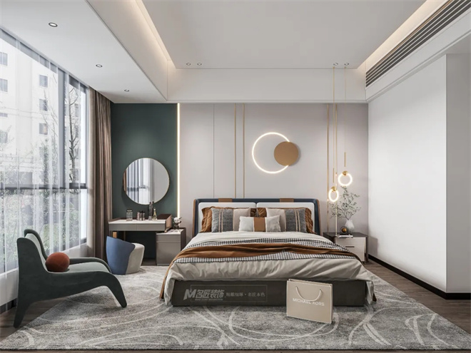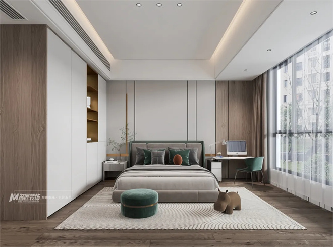睡眠區(qū)沉靜的灰色能讓人迅速進(jìn)入靜默休息的狀態(tài);衣妝區(qū)搭配清雅的綠,能在一天的清晨中感受自然的氣息。