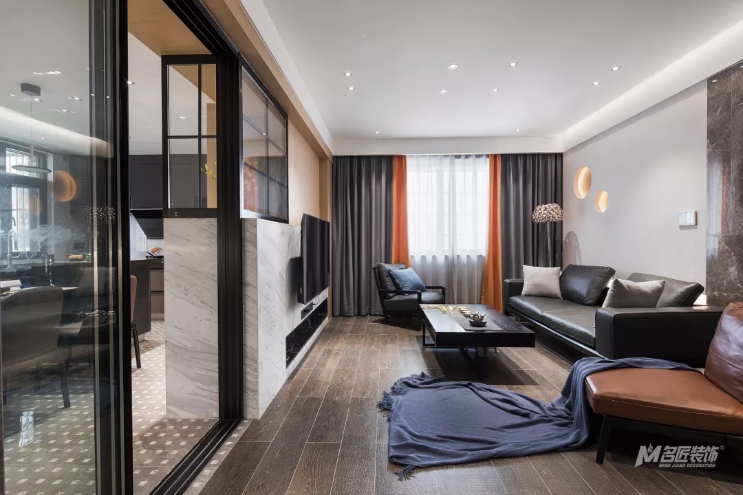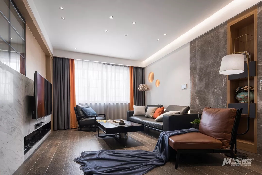 整潔清爽的客廳,由高級灰搭配著原木色、愛馬仕橙,時(shí)尚氣息濃郁,又有著自然的溫暖感受。