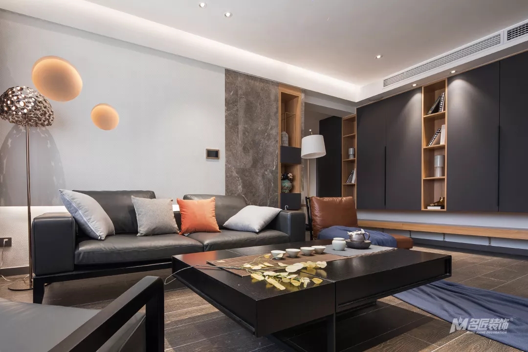 黑色的皮藝沙發(fā)與細(xì)膩的高級灰背景墻,氛圍更顯沉穩(wěn)大氣,平靜祥和,瞬間讓人忘記室外喧鬧的世界。
