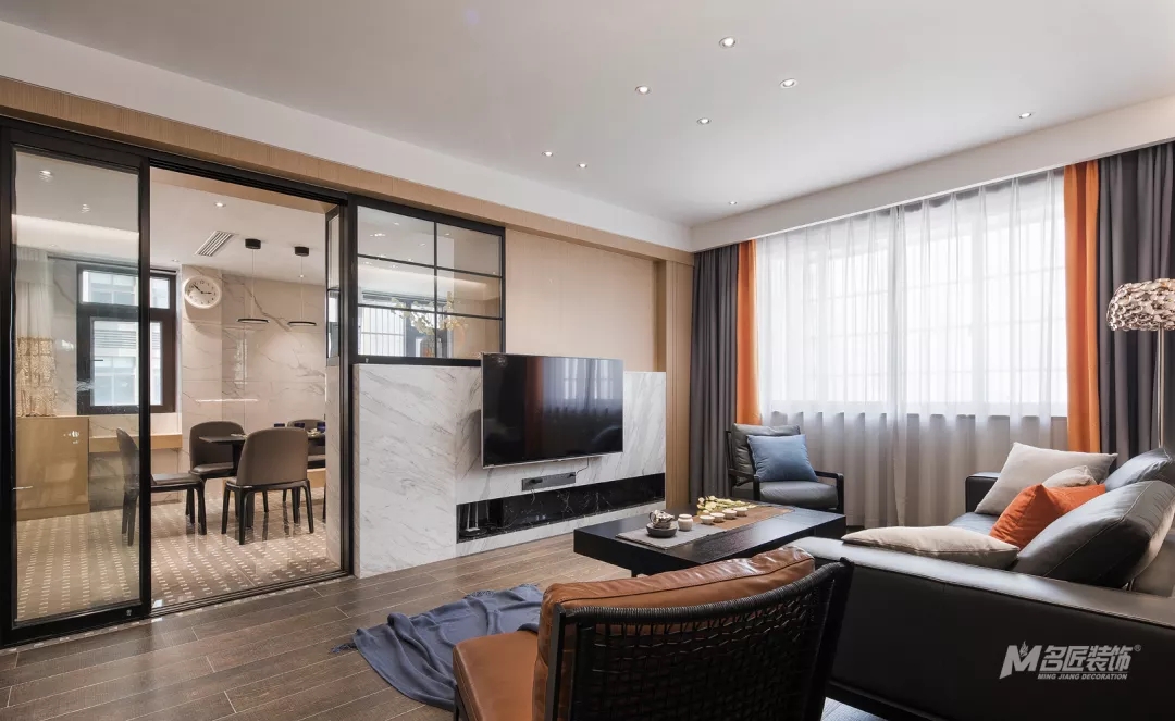重新規(guī)劃改造的電視背景墻,以半高大理石隔斷加上木飾面,一冷一暖,精致的棱角,空間顯得規(guī)整也別有一番情調(diào)。