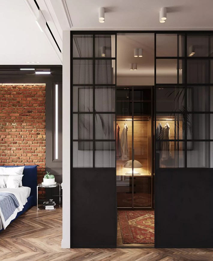 采用平開門、推拉門的形式,選擇透明或磨砂質(zhì)感的隔斷門將衣帽間包圍在里面,時(shí)尚材質(zhì)帶來通透的視野,不僅防塵,還具有特別高的顏值!