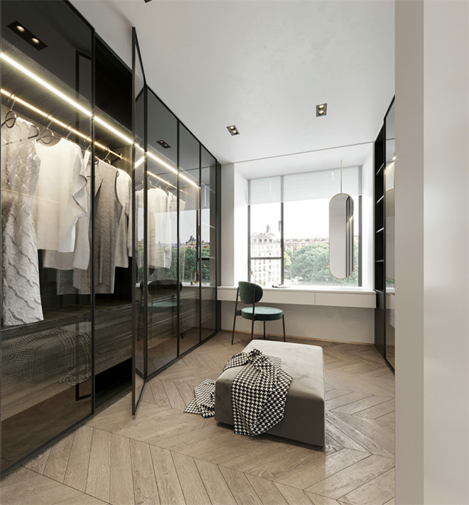3.步入式衣帽間還應(yīng)合理組織燈光和色彩,使其既能融入所有室內(nèi)特色,又能堅(jiān)持自身的情調(diào)。在照明方案上,最好使用熒光燈等接近自然光的光源,讓這件類似衣帽間的衣服顏色接近正常。