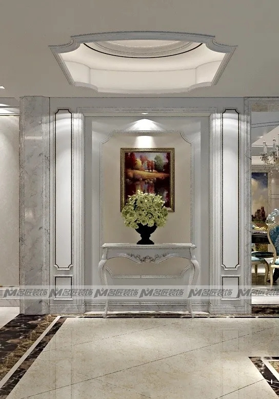 花紋對(duì)稱的金色大理石沙發(fā)墻面,線條對(duì)稱的白色窄框石膏線,以及復(fù)古的臺(tái)燈、擺飾,都展現(xiàn)出空間的規(guī)律美感,在視覺上達(dá)到平衡。造型古典的彎腿式沙發(fā),華麗的吊燈,精美的雕花鏤空隔斷,別致的拼花地磚,塑造出高貴典雅從容的居住空間。