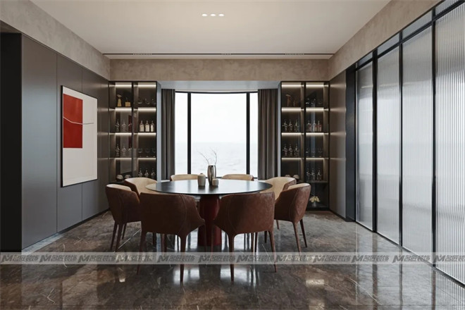 餐廳延續(xù)了客廳的無主燈設(shè)計(jì),柜子藏光的設(shè)計(jì),不僅起到裝飾作用,也突出空間的物品陳列。色彩分明的裝飾畫,瞬間提升居室格調(diào)。