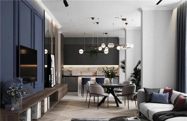 白色背景墻與電視墻藍色調(diào)相結(jié)合,形成一種清新明亮的視覺效果,搭配一些原木色家具,營造出一個簡約而有型的輕文藝之家。