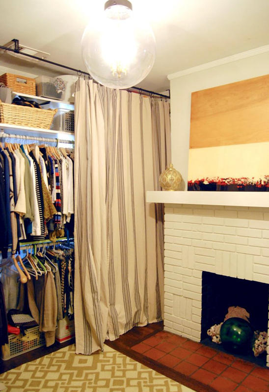 不想在衣柜上安裝門板,也可以用采用布簾隔斷的方式,在柜頂或天花板上裝個軌道,掛上棉布、絲絨、紗簾等材質的簾子,將開放式衣帽間變成一個獨立的空間,既簡單方便,又能防塵。