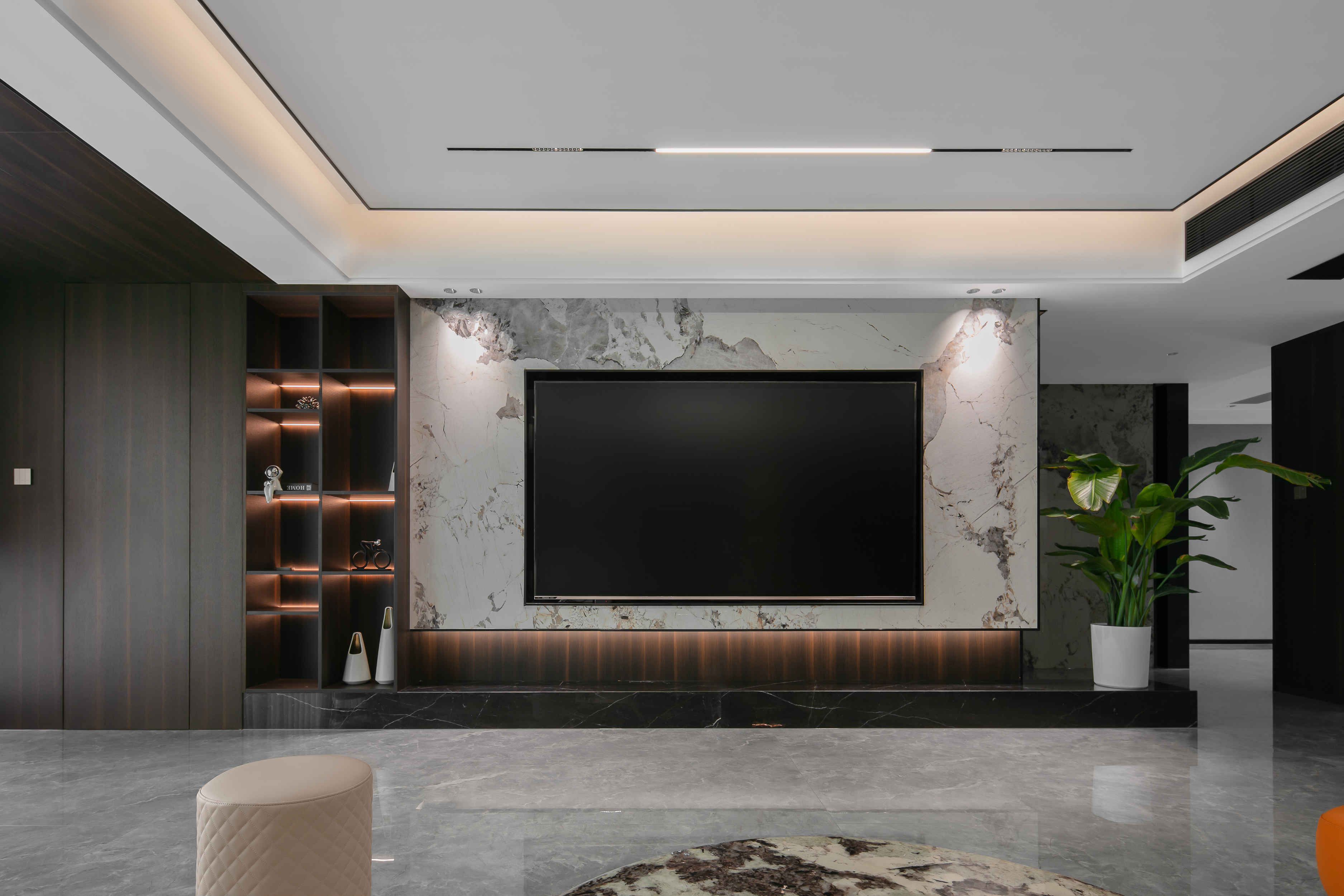 真正的無(wú)主燈,不是滿屋子亂裝射燈,而是有邏輯的三層布局:基礎(chǔ)照明打底,重點(diǎn)照明點(diǎn)睛,裝飾照明升溫。比如客廳的無(wú)主燈設(shè)計(jì),可以用筒燈或者磁吸軌道燈等來(lái)均勻布光,用射燈聚焦客廳的裝飾擺件、墻面等營(yíng)造視覺(jué)焦點(diǎn),用落地?zé)艋驘魩I(yíng)造溫馨感,讓整個(gè)空間立刻立體起來(lái)。建議每個(gè)空間至少具備兩層照明,客廳、餐廳建議三層。